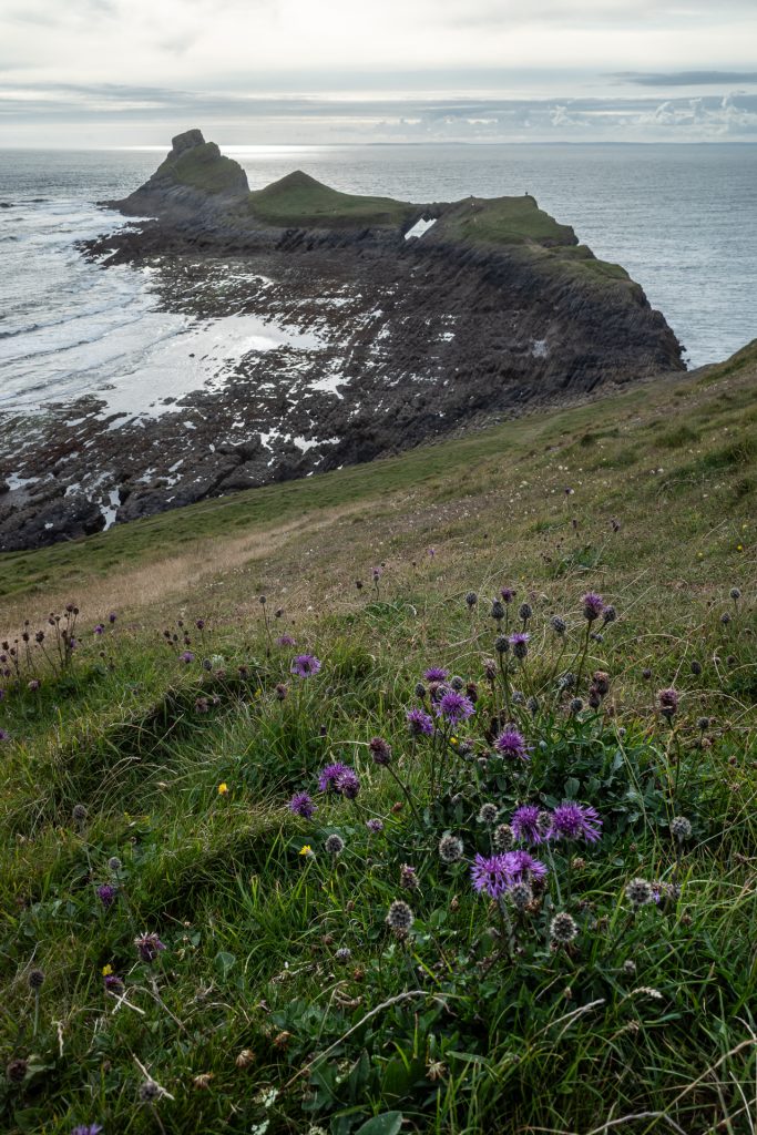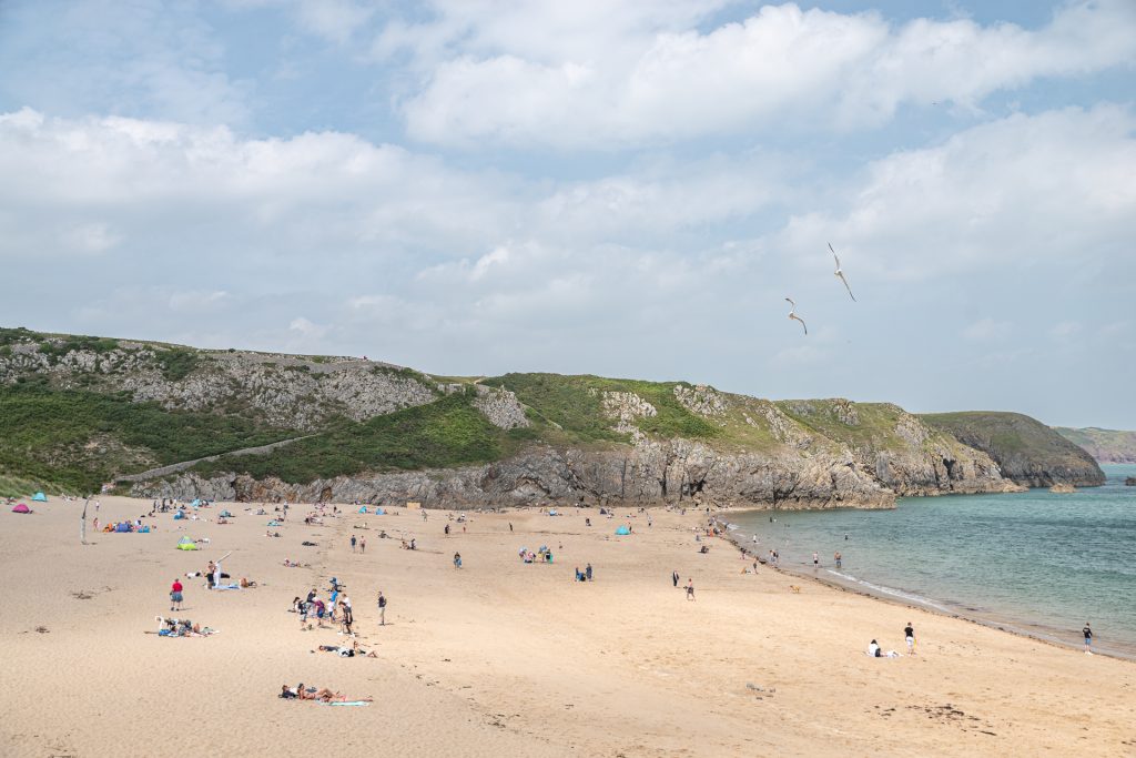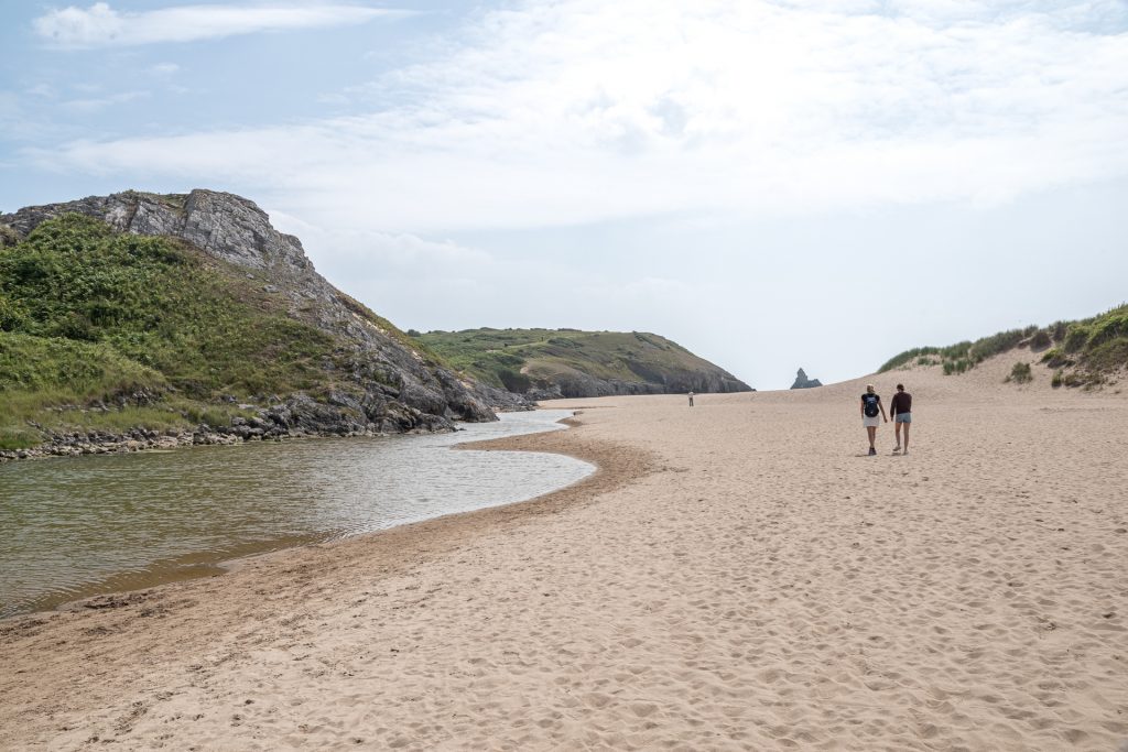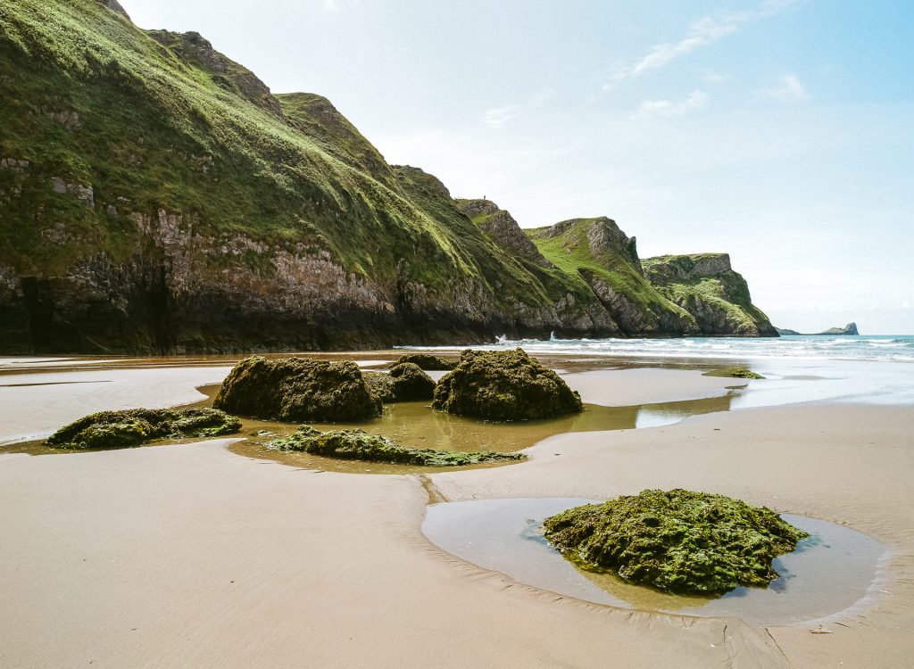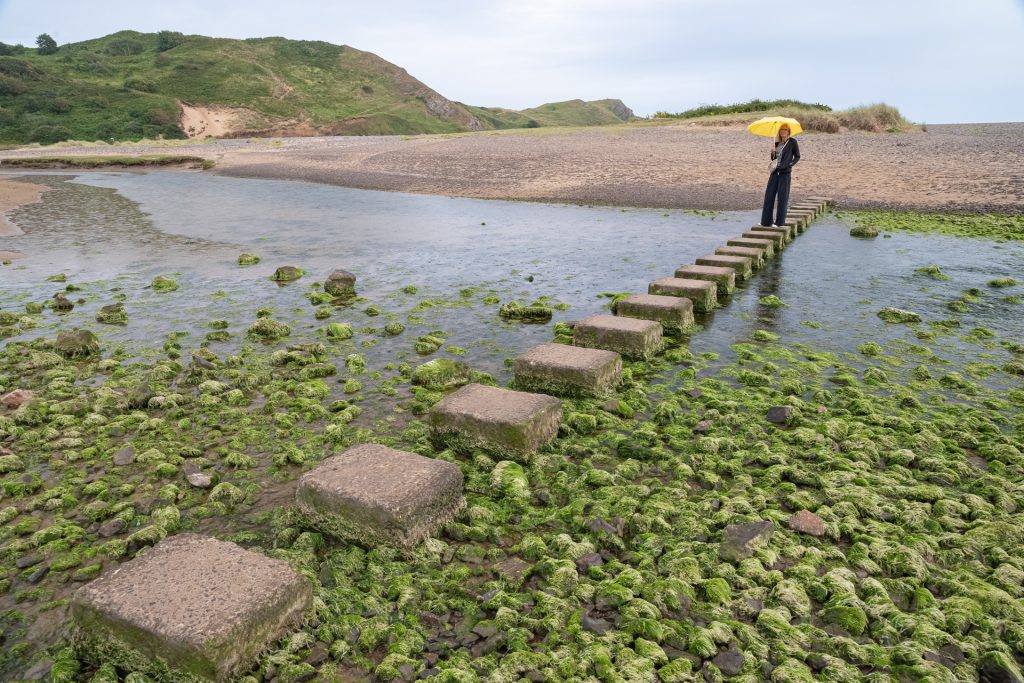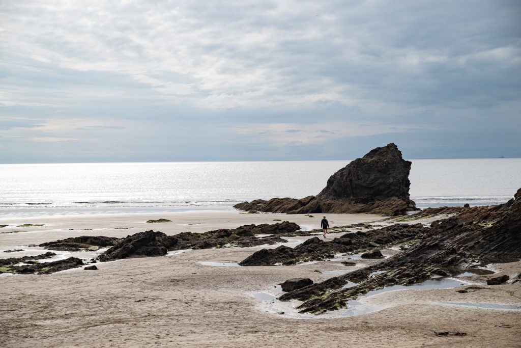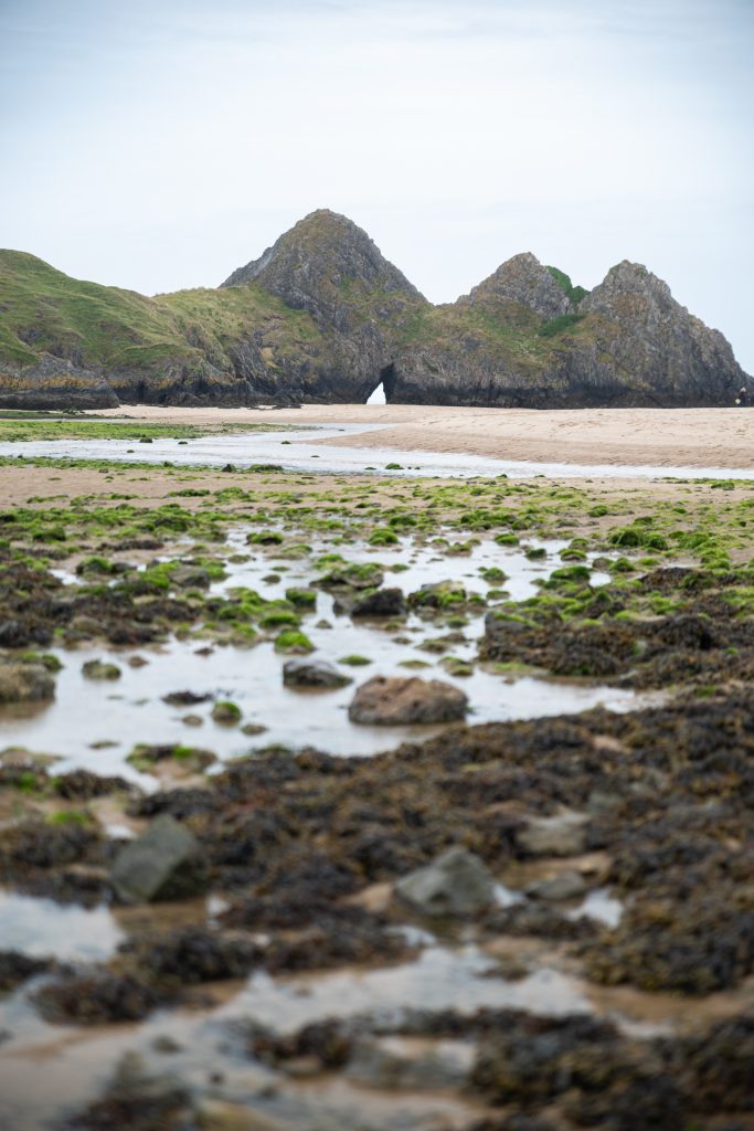 Weniger als eine Stunde von Brecon Beacons entfernt nach Westen, vorbei an Swansea, liegt die Halbinsel Gower. Das Hochland fällt vor allem an der Süd- und Westküste steil zum Meer ab und bietet dort wunderschöne Strände und Steilküsten. Unser Häuschen in einem kleinen Ferienpark lag relativ zentral auf der Insel. Unser erstes Ausflugsziel war die Three Cliffs Bay an der Südküste von Gower bei leichten Nieselregen. Nicht das Wetter, was wir uns gewünscht haben, aber irgendwie typisch für die Insel. Die namensgebenden Kliffe sind vom Strand her nur bei Ebbe erreichbar, auf den Weg dahin überquerten wir die Stepping Stones, die tatsächlich bei Google Maps als Sehenswürdigkeit ausgewiesen werden.