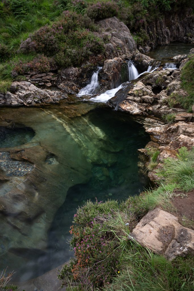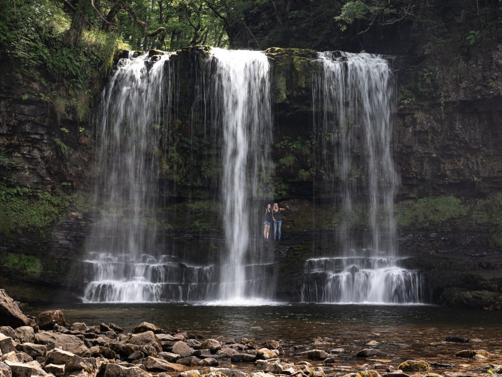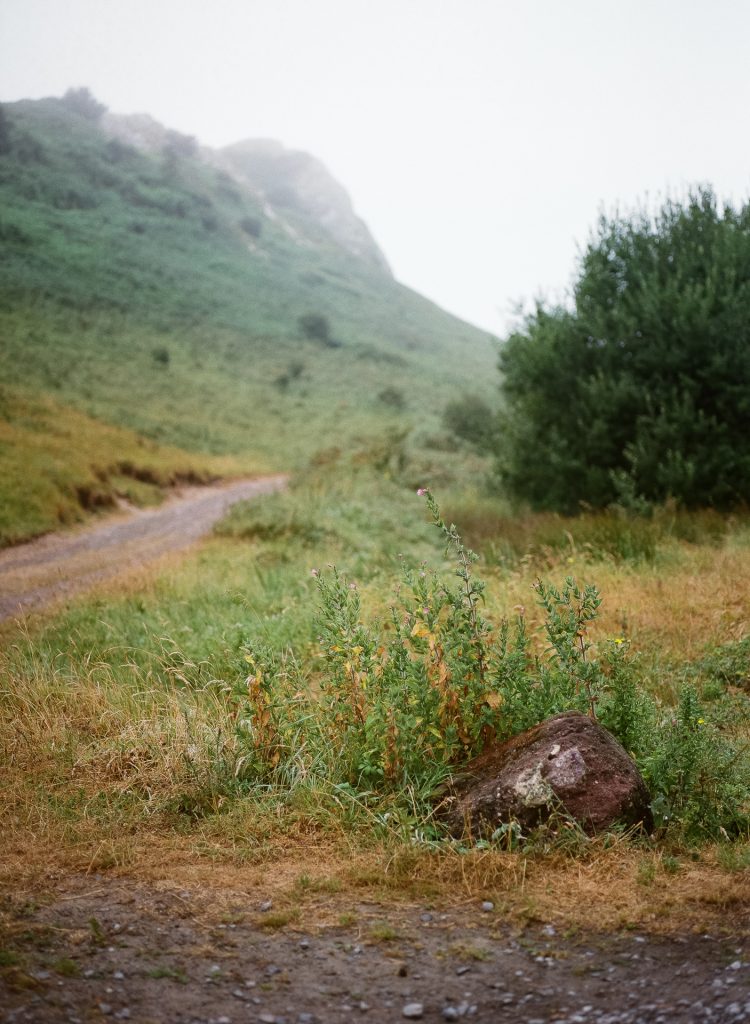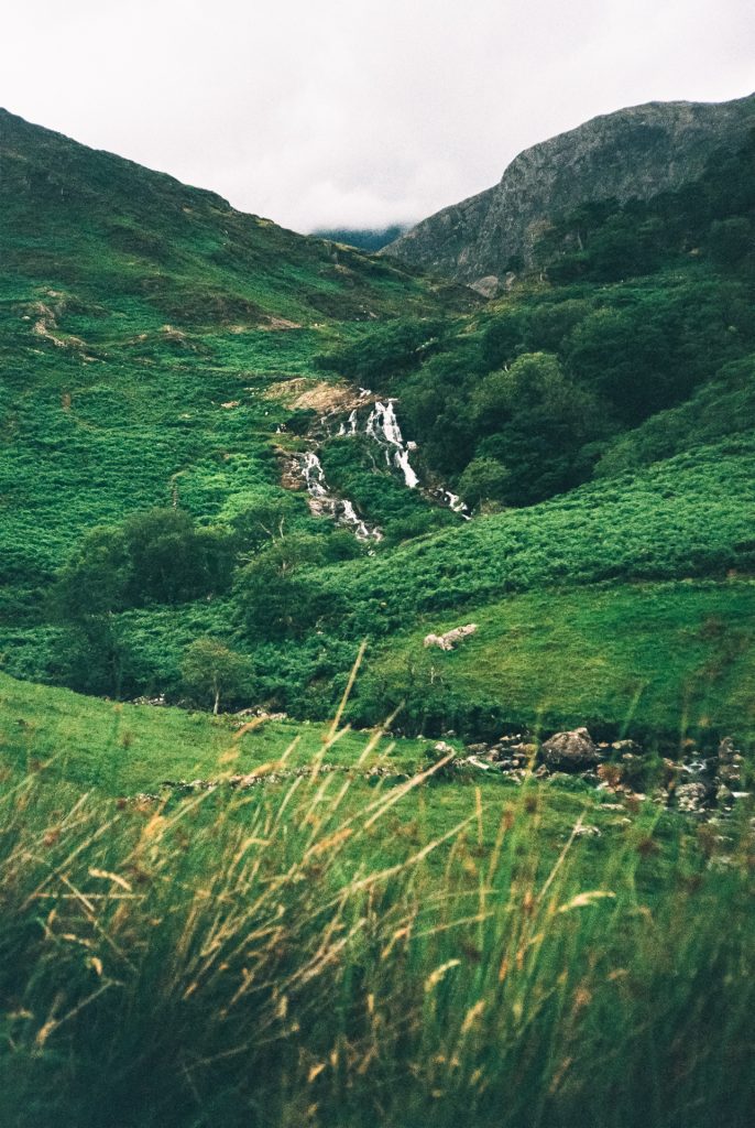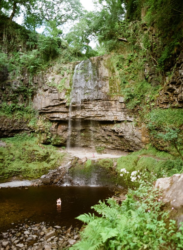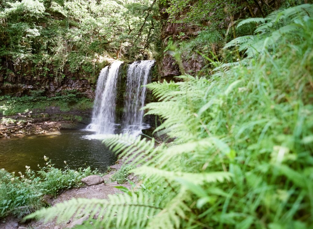 Brecon Beacons ist auch bekannt für seine vielen Wasserfälle. Die Wochen vor unserem Urlaub im Juli gab es in Wales eine untypische Hitzeperiode wie unsere Wirtin erzählte. Die Flüsse und Wasserfälle führten weniger Wasser mit sich als gewohnt. Das zweite Foto mit dem vielen unscharfen Farn im Vordergrund erinnert mich an den ersten Schrecken dieser Reise. Ich hatte zunächst einige digitale Fotos meiner Familie am Wasserfall gemacht und leider meinen Fotorucksack nicht richtig geschlossen. Beim Hochheben fiel meine 645 heraus und stürzte mit dem Objektiv vorab aus einem Meter Höhe auf den Felsen. Auf den ersten Blick hatte nur die Optik eine tiefe Delle am Filterring abbekommen. Die Kamera und das 35mm Weitwinkel funktionierten noch. Ich habe mich so geärgert – und zugleich gefreut, dass ich noch weiter analog fotografieren konnte.