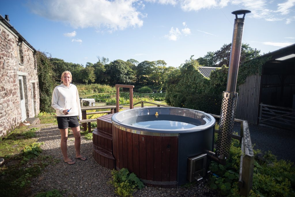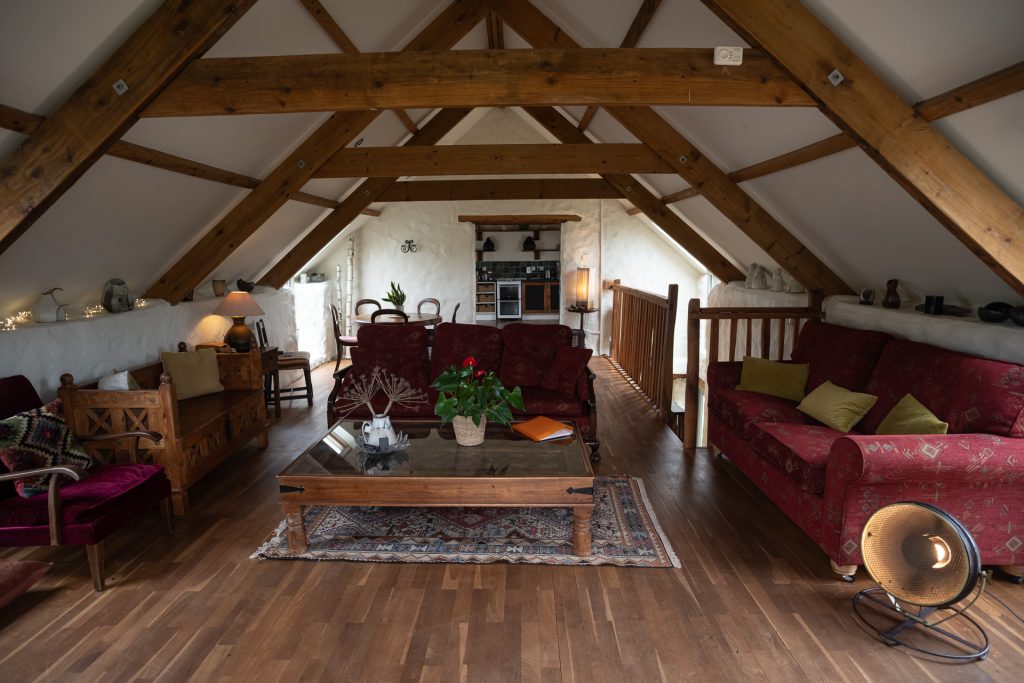 Unser Ferienhaus … davon möchte ich auch ein paar Fotos zeigen, denn wir haben uns auf der Ford Farm so wohl gefühlt, dass wir noch am ersten Abend unsere Reiseroute umdisponierten, um an diesem wunderschönen Ort noch länger bleiben zu können. Die drei Schlafräume und Bäder lagen unten, während die offene Küche und der Wohnbereich unter dem Dach waren. Dazu kam ein großes Grundstück mit Teich und Kapsel-förmigen Gartenhaus und zutraulichen Hühnern. Höhepunkt war draußen ein mit Holzfeuer beheizter Whirlpool.