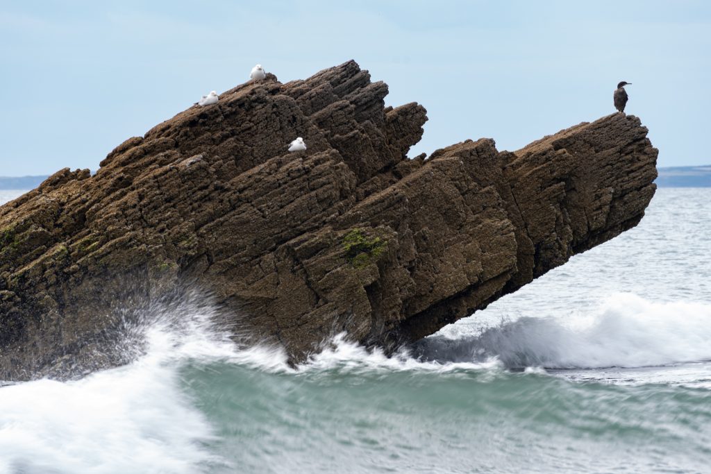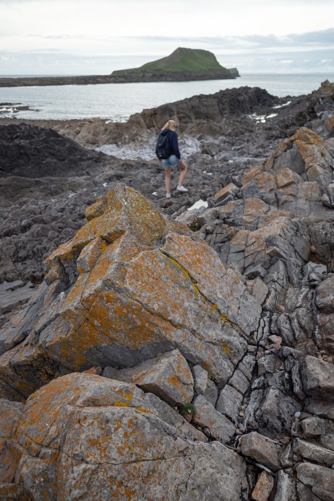 Aber noch einmal zurück zur Rhossili Bay. Nachdem der Schrecken der defekten 645 verarbeitet war, kehrten meine Frau und ich am Nachmittag noch einmal zu diesem Ort zurück. An der Spitze der Bucht liegt Worms Head, eine vorgelagerte Insel, die in der Form an einen Drachen erinnern soll und nur bei Ebbe besucht werden kann und darf. Die Herausforderung dieser Wanderung (ab und an auch Kletterpartie) ist das enge Zeitfenster, denn bei Flut ist der für sich schon anspruchsvolle Weg über scharfkantige Klippen vom Meer überspült und nicht mehr begehbar. Aber die Aussicht auf Worms Head entschädigt, auch wenn wir nicht bis zum Ende gelaufen sind.