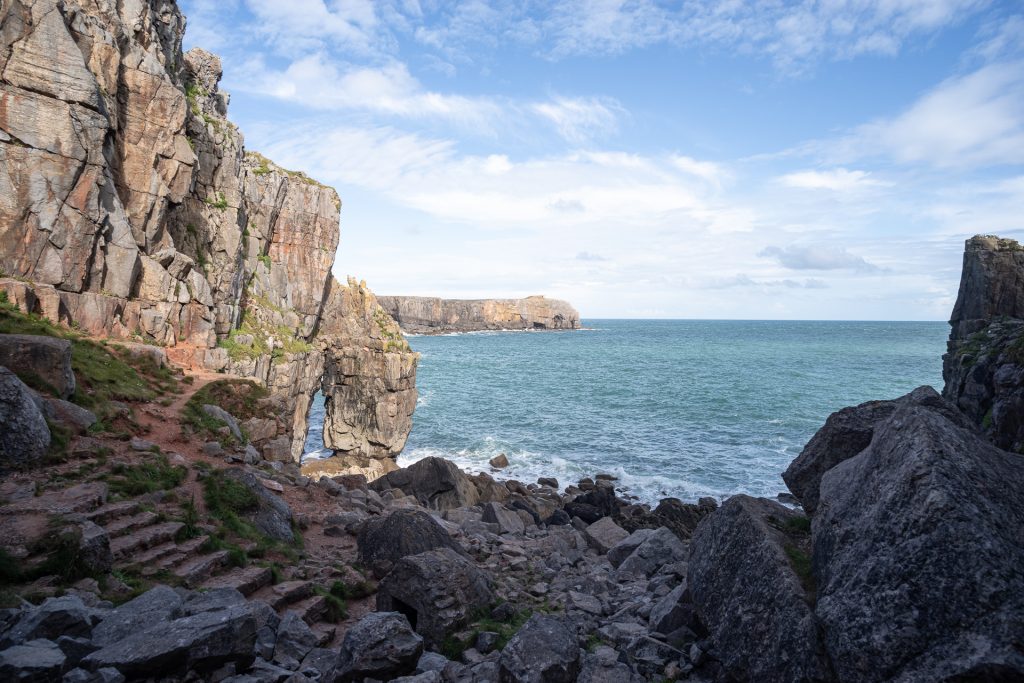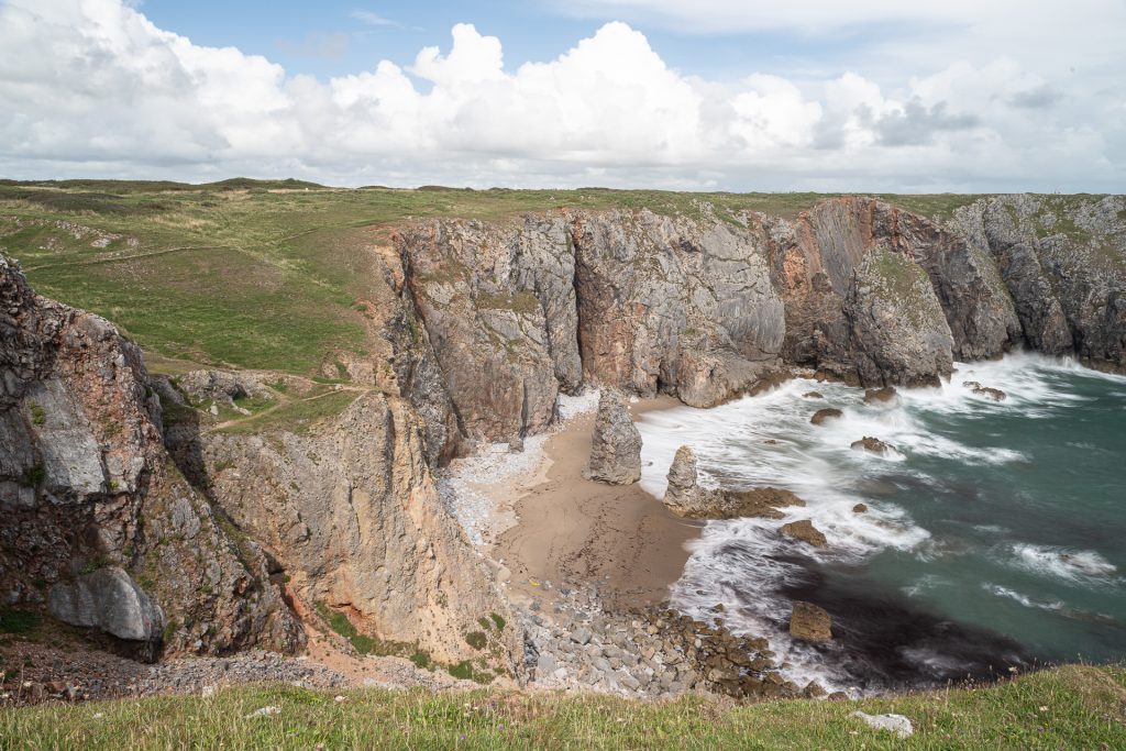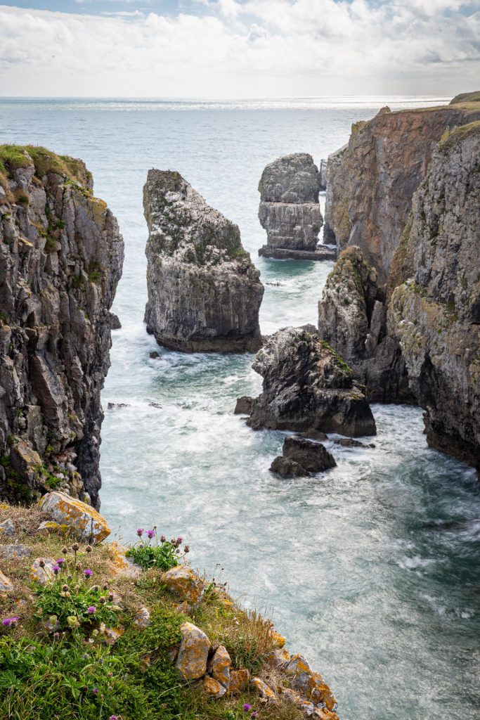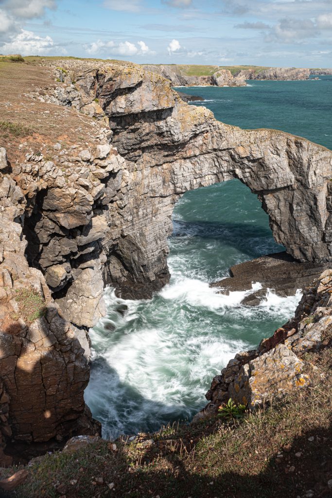 Pembrokeshire hat soviel zu bieten, viel zu viel für unseren (trotz Verlängerung) kurzen Aufenthalt von fünf Tagen. Ein Highlight war der Tagesausflug an die Südküste zu den Stack Rocks. Vom den Stack Rocks Car Park führt ein kurzer Weg zum Küstenwanderweg mit seinen spektakulären Ausblicken. Hotspots sind hier die Elegug Stacks sowie die Green Bridge of Wales, einer Kalksteinformation in Form einer Brücke. Mit meiner Familie hatte ich vereinbart, dass sie einige Meilen den Weg weiterlaufen sollten, während ich mir viel Zeit zum Fotografieren der Highlights mit Stativ und Filter nehmen durfte. Wer genau hinschaut: bei dem Foto der Felsbrücke ist ein Schattenselfie mit Pia integriert.