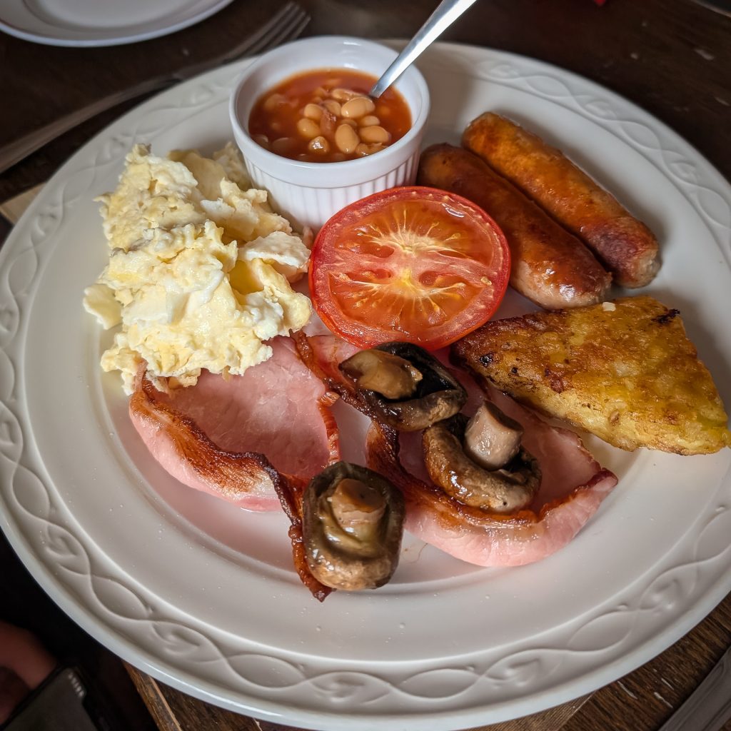 Los geht es in der Region Brecon Beacons, etwa eine dreiviertel Stunde entfernt von der Hauptstadt Cardiff ganz in Süden von Wales. Hier dominieren sanfte Hügel und Wasserfälle. Für die ersten drei Nächte hatten wir zwei Zimmer über einem Pub mit dem schönen Namen The Rheolau Arms in dem kleinen Dorf Abercrave gebucht. Hier gab es am ersten Morgen auch gleich das besondere kulinarische Erlebnis eines britischen Frühstücks.
